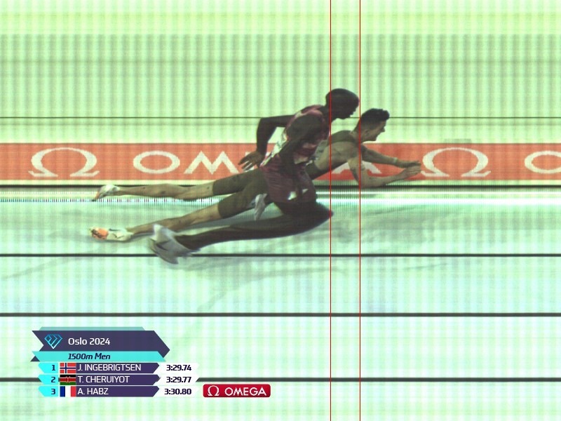 The official timekeeper’s clock showed a world lead of 3:29.74, which made Ingebrigtsen’s desperate dive the OMEGA Moment of the Meeting on a night when several records fell.