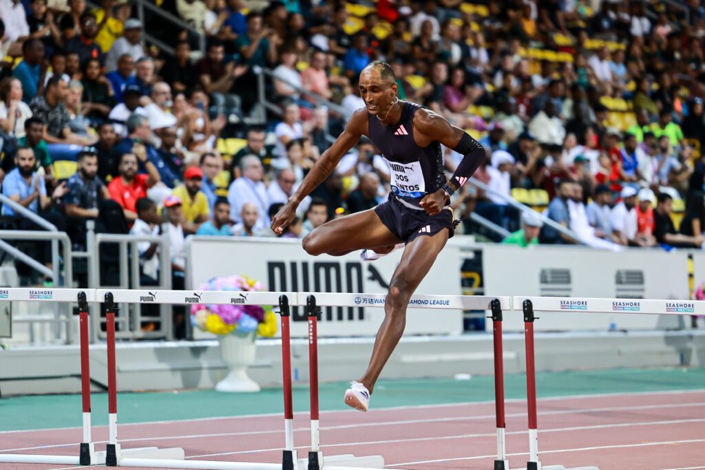 Drawn in lane five, Dos Santos took an early lead, helped by having the fast-starting CJ Allen to chase down in the lane outside him. As they came off the final bend and the stagger unwound, Dos Santos breezed past the US hurdler and went on to open up a significant lead down the home straight.