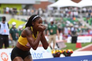 Elaine Thompson-Herah was the star of the show on a sparkling afternoon of records at the eighth Wanda Diamond League meeting of the season in Eugene.