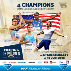 The curtain fell on the indoor season on Sunday 4 March on the evening of the Worlds in Birmingham. Already though, all eyes are on the 14-episode IAAF Diamond League serial. And there’s good news for the French leg, scheduled for Saturday 30 June 2018 at the Charléty Stadium: four of the heroes from the IAAF World Indoor Championships in Birmingham, last weekend, have confirmed their presence at the MEETING de PARIS. American Christian Coleman, Russian Mariya Lasitskene and French athletes Renaud Lavillenie and Kevin Mayer, all gold medallists in the UK, will be competing in the Parisian meeting.
